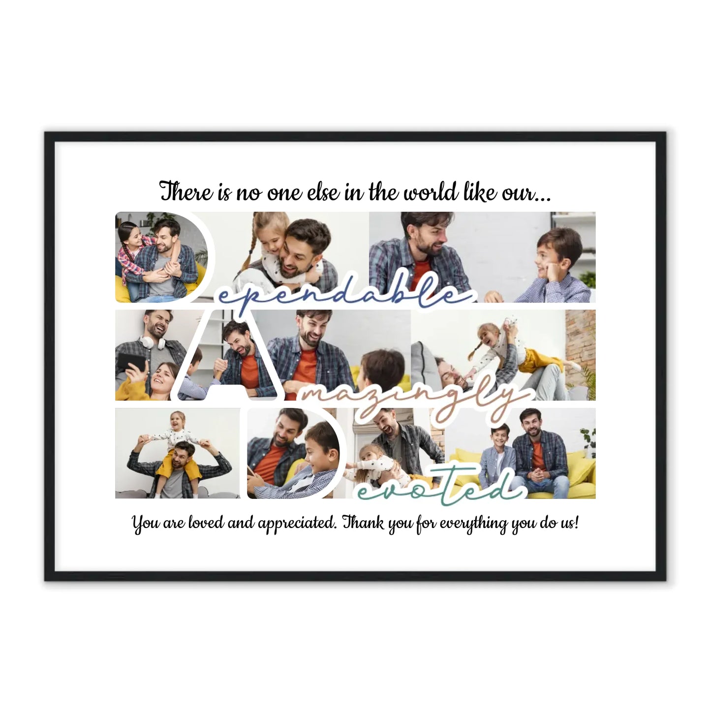 Celebrate the bond with your Dad this Father's day in a truly unique way. Our stunning personalised poster is thoughtfully crafted to capture the essence of your love, featuring DAD letters to showcase cherished memories. Each photo is beautifully arranged in the letter composition.